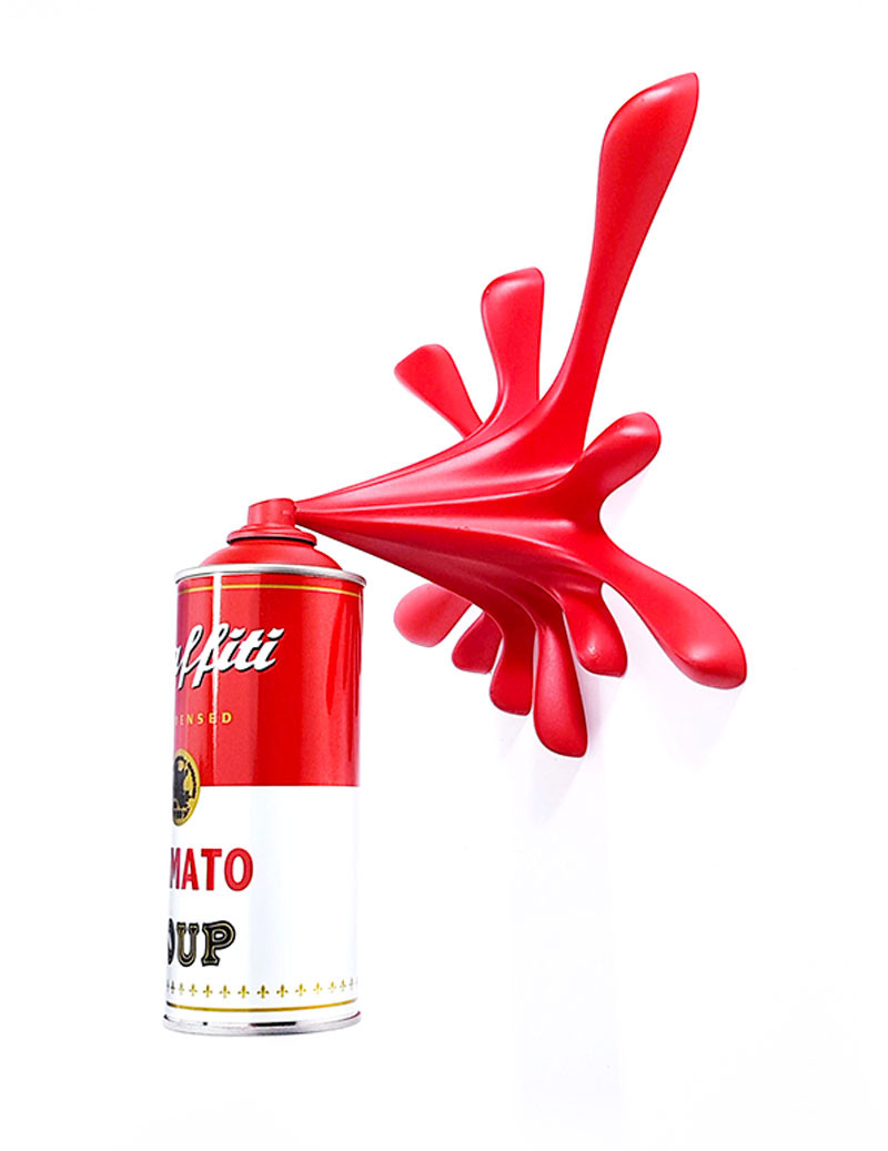His Splashes depict an imaginary process of graffiti writing where a spray can disperses a colourful splash and simultaneously translates a dynamic action, into a static form on the wall. Each creation is coloured by hand, making each piece an original work of art. They come with a hole in the back for easy mounting. You can easily hang them on your wall and enjoy a splash of street art in your personal space. The materials used are non-combustible polyurethane resin and empty (used) spray cans with real cap
