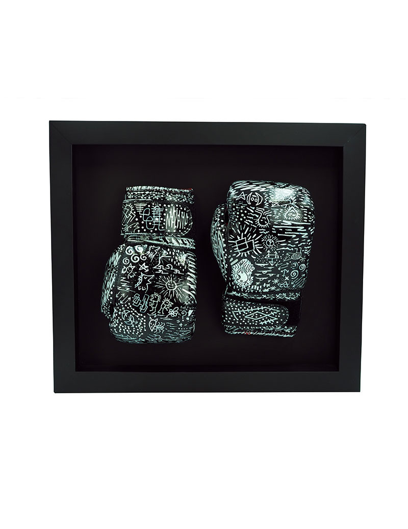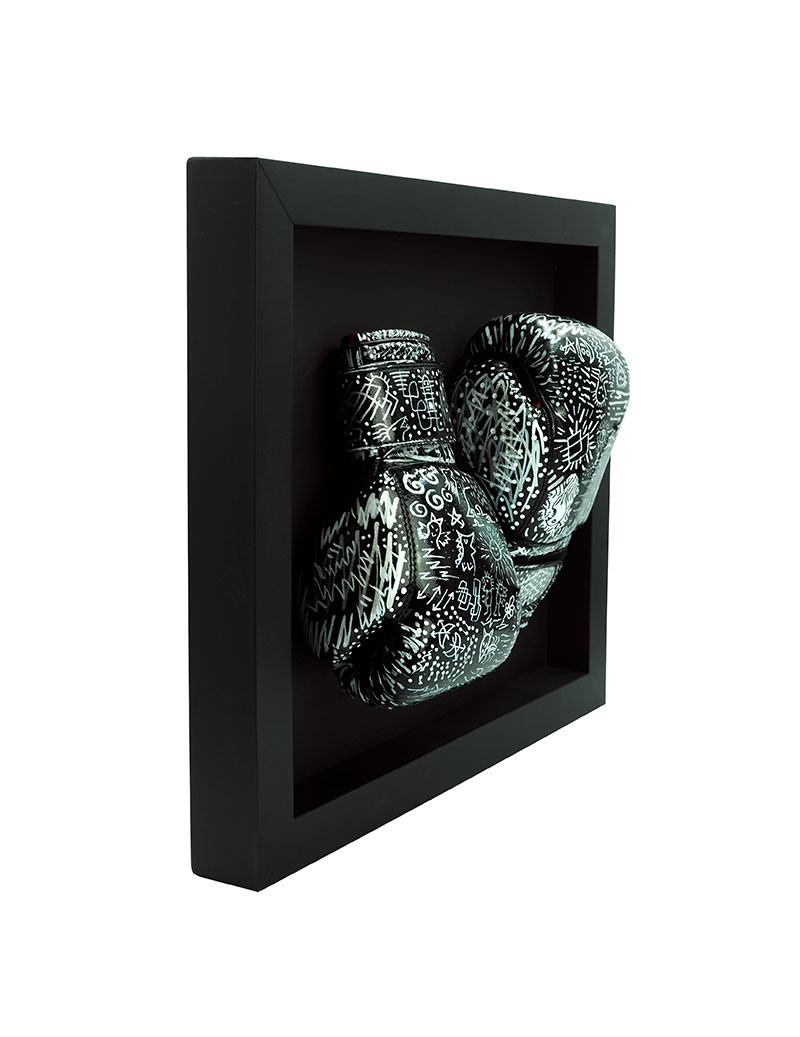 Technique: Real boxing gloves on wooden frame, painted with black and white spray, markers and acrylics